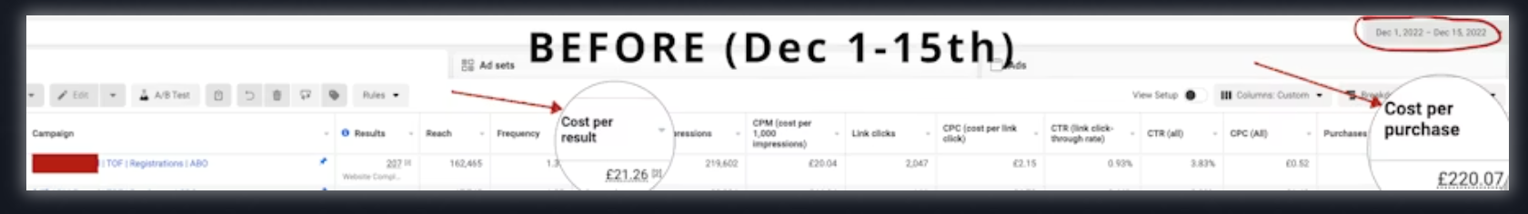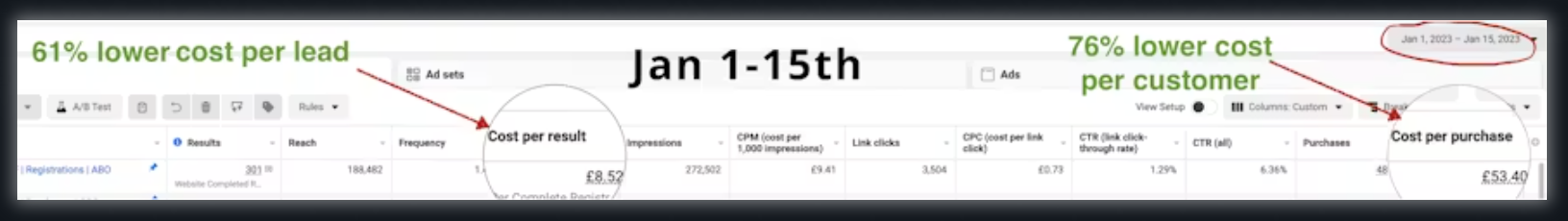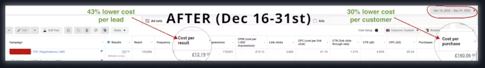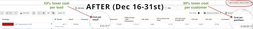 Cost per lead has been slashed by 43% and the cost per customer decreased by 30% in only 2 weeks (during the most expensive time of the year for running ads).